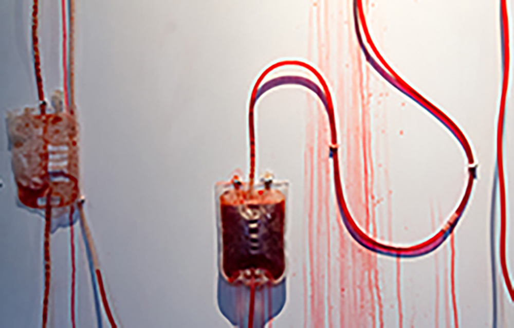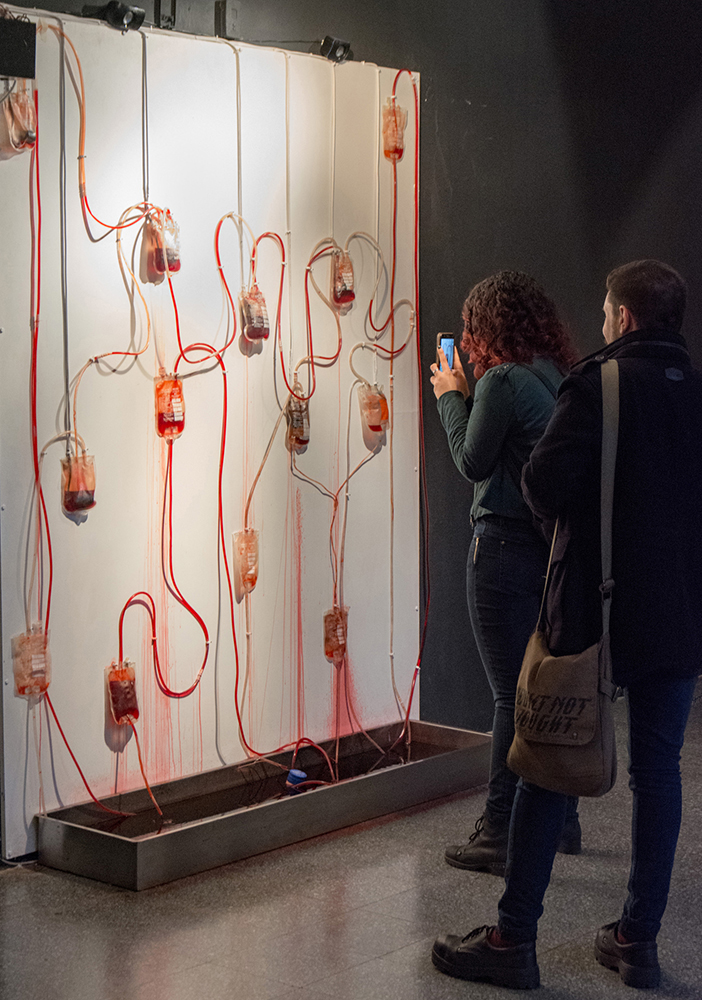 Transfusion bags. Artificial blood, pumps electronically regulated with Arduino, Steel. Mounted on board.